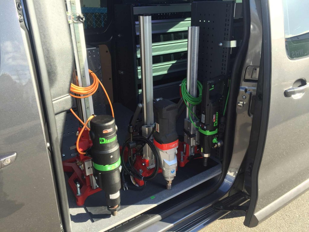 Für die ordnungsgemäße Ladungssicherung der Kernbohrmaschienen wurden spezielle Halterungen in dem Fahrzeugboden integriert. Diese ermöglichen ein leichtes beladen und befesteigen der Maschienen, zum Schutz des Fahrzeugbodens wurde außerdem eine Antirutschmatte auf den Boden geklebt.
