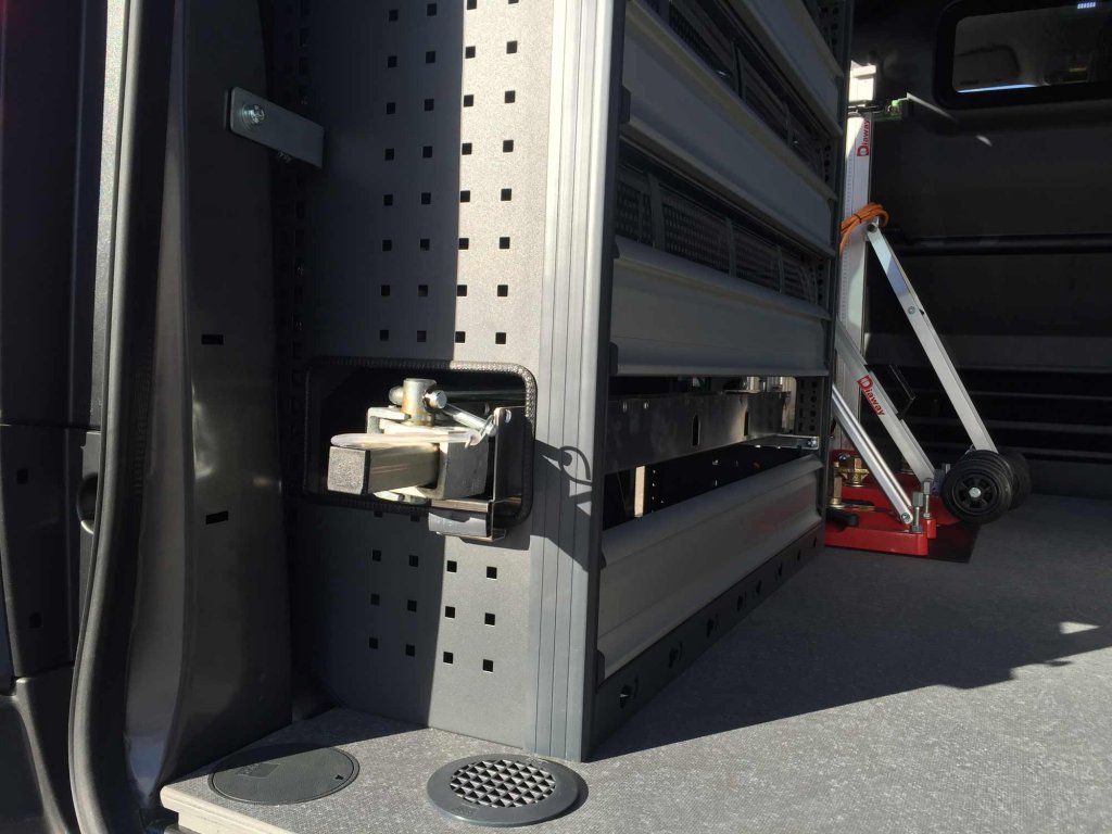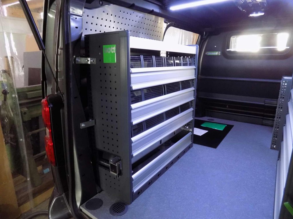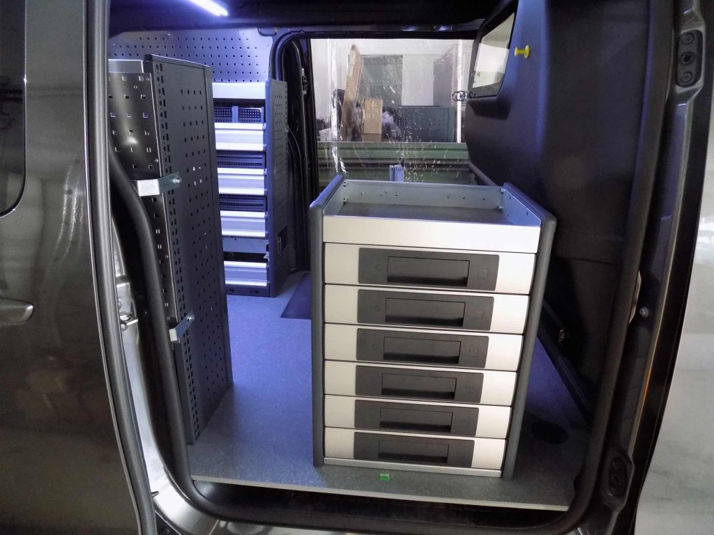 Bei diesem Ausbau wurde darauf gedachtet das die Kernbohrmaschinen ordnungsgemäß befestigt werden. Neben den Kernbohrmaschinen wird viel Platz für Kleinteile und Ersatzeile benötigt. Dafür wurde in den Regalmodulen Klappenböden verbaut, hier kan der Kunde die bottBoxen und andere Kisten verstauen. An der Schiebtür wurde ein Schubladenschrank mit 100mm hohen Schubladen verbaut.