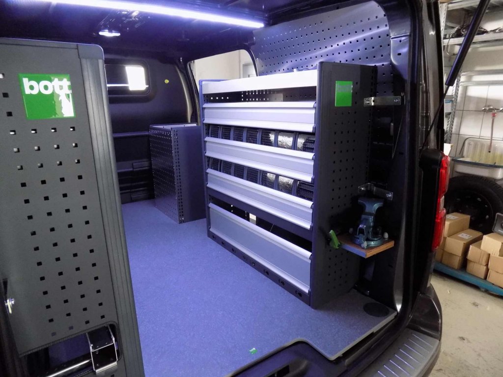 Auch für die Befestigungsstange der Kernbohrmaschine wurde ein Platz in dem Kleintransporter gefunden, diese werden durch die bott Langteileträger auf der linken Seite der Fahrzeugeinrichtung optimal in die Einrichtung integriert.